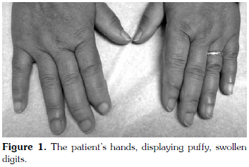 Physical examination was remarkable for puffy, swollen digits (Figure 1) and nail fold changes consisting of dilated capillary loops at the base of the nails bilaterally of all fingers, which were clearly visible to the naked eye (Figure 2). The proximal interphalangeal joints were tender bilaterally with palpable synovitis.