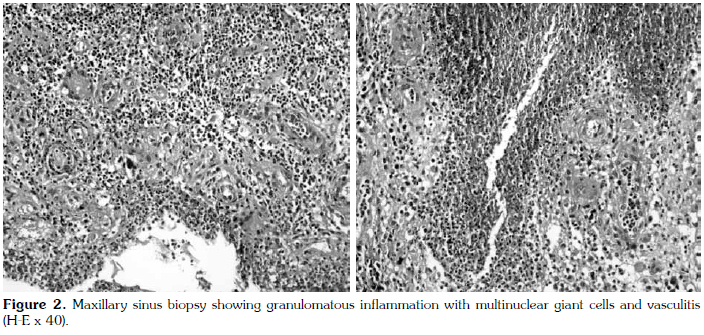 The medical history with CT findings gave a suspicion of underlying WG. Further evaluation revealed normal chest X-ray findings and complement 3 (C3) and 4 (C4) values of 154 mg/dl (79-152) and 34 mg/dl (16-38), respectively. The anti-nuclear antibody (ANA) titer was 1/80, anti-double stranded DNA (anti-dsDNA) was negative, and the myeloperoxidase antineutrophil cytoplasmic antibodies (MPO-ANCAs) was less than 2.0 U/ml (<20). Cytoplasmic-staining antineutrophil cytoplasmic antibodies (c-ANCAs) and proteinase-3 (PR3), was above 200 U/ml (<20). Thoracic CT and renal ultrasonography produced normal results. Definite diagnosis was made by punch biopsy of the maxillary sinus wall. Examination of the biopsy material revealed chronic granulomatous inflammation with numerous multinuclear giant cells, foci of microabscesses, and vasculitis consistent with WG (Figure 2). Antibiotic treatment was discontinued, while cyclophosphamide and prednisolone treatment was started.