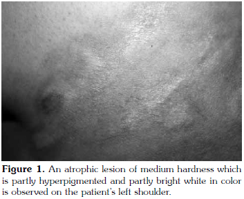 As a result of clinical, pathological evaluation and laboratory examination, the patient was diagnosed with circumscribed morphea (localized scleroderma). She had only one lesion and topical clobetasol propionate was applied once a day as the treatment. Clinical improvement in the lesion was evident by the end of six weeks. In the clinical follow-up, there was no new lesion and recurrence was not seen in the old lesion.