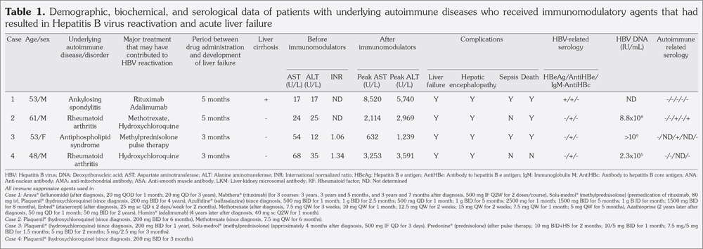 Patients and methods: We assessed 164 patients newly registered as liver transplant candidates at the National Taiwan University Hospital in 2010. Four patients (2.4%) also had underlying autoimmune disease and received immunomodulatory therapy which resulted in HBV reactivation and acute liver failure, which manifested as progressive hyperbilirubinemia and coagulopathy. The median time of survival of these patients was estimated using the Kaplan-Meier method.