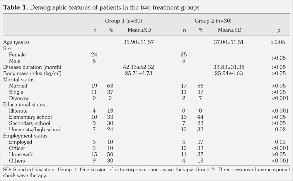 70 patients were found to be eligible for the study. Six of these patients refused to receive ESWT at the initial visit, and the remaining 64 patients were randomized into two groups of 30 patients each (group 1; 24 women and 6 men; mean age