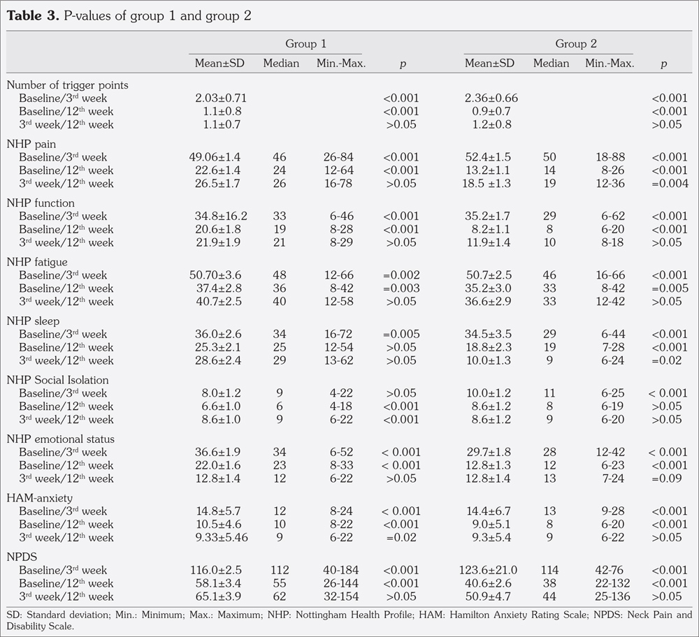 12 weeks after treatment in the number of TPs, pain, PGA, MDGA, NPDS, NHP and HAM-A scores when compared with the pre-treatment values, in both group 1 and group 2, (p<0.01, for each) (Table 2 and Table 3).