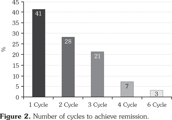 1 cycle, 10 patients received 2 cycles, whereas eight patients received a third cycle.