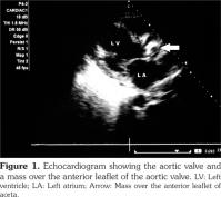 The patient had normocytic normochromic anemia with a hemoglobin level of 8 g/dL, white blood cell count of 14000/mm3 with 80% neutrophils, serum urea value of 80 mg/dL, and serum creatinine value of 2.5 mg/dL. Serum electrolytes and liver function test results were normal. Urinalysis examination revealed protein 3+, and 15-20 red blood cells per high power field. Twenty-four-hour urine protein was 1.2 grams. Abdominal ultrasound revealed enlarged kidneys with increased echotexture and altered corticomedullary differentiation. Thoracic X-ray demonstrated bilateral pulmonary infiltrates, while computed tomography revealed bilateral patchy opacities with thickening of the right horizontal fissure and bilateral alveolar infiltrates. Echocardiography also revealed a mass over the anterior aortic valve with mild aortic stenosis and moderate aortic regurgitation (Figure 1). Anti-neutrophilic cytoplasmic antibody (ANCA) serology showed a markedly increased level of anti-proteinase 3 (anti-PR3) (31 IU/ml, cut off ≤3.5 IU/ml), and anti-myeloperoxidase (anti-MPO) level of 2.1 IU/ml (cut off ≤9 IU/ml). Blood cultures were sterile. Antinuclear antibodies, human immunodeficiency virus, hepatits B surface antigen, hepatitis C virus serologies and sputum for acid-fast bacilli were negative. A preliminary diagnosis of GPA with acute nephritis and probable alveolar hemorrhage were made based on the possibility of concomitant infective endocarditis/involvement due to GPA. The patient was firstly treated with broad-spectrum antibiotics. However, after three days of no response to the antibiotic therapy, the patient was started on pulse methylprednisolone doses of one gram per day for five days along with pulse cyclophosphamide of 750 mg, and the antibiotics were also continued. The patient improved over a period of one week, and his hemoptysis stopped. His repeat urea was 60 mg/dL, and serum creatinine level was 1.5 mg/dL. The patient was discharged with prednisolone 60 mg per day and was asked to apply to the outpatient department for the next pulse of cyclophosphamide. However, the patient did not report back and was lost to follow-up.