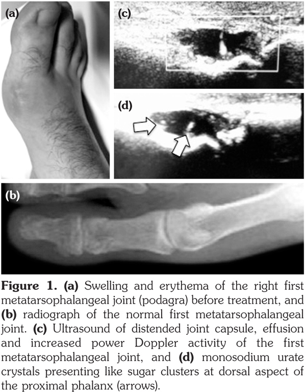 A 49-year-old man was admitted to our clinic with pain, acute-onset swelling, and local erythema in his right big toe. He was under valsartan hydrochlorothiazide treatment for hypertension. The medical history was non-specific. He did have no constitutional symptoms such as morning stiffness, fatigue and fever. Physical examination revealed swelling, local erythema (Figure 1a) and pain on palpation of the right big toe. Serum C-reactive protein level was 14.6 mg/L (normal range: <10), and uric acid level was 10.1 mg/dl (normal range: 3.5-7.2). Complete blood count, erythrocyte sedimentation rate, blood urea nitrogen and creatinine levels were within normal limits. While foot radiograph was unremarkable (Figure 1b), ultrasonography showed sugar cluster appearance and effusion with increased power Doppler activity (Figure 1c, d). Monosodium urate crystals were detected in synovial fluid aspiration, and the patient was diagnosed with gout. Oral colchicine 1 mg/d and diclofenac sodium 150 mg/d were commenced. Valsartan hydrochlorothiazide was changed to valsartan, and amlodipine was added for hypertension treatment. Uric acid poor diet and hydration were also recommended. Uric acid levels were 9.1 and 7.1 mg/dl at the first and sixth month controls, respectively. A significant improvement in the swelling was detected on physical examination (Figure 2a). On the other hand, ultrasonography showed erosion of the proximal phalanx (Figure 2b).Gout is one of the most common forms of inflammatory arthritis characterized by the crystallization of uric acid (monosodium urate crystal deposition) within the joints.(1) The first metatarsophalangeal joint is distinctive, and 50 to 90% of the attacks involve the first metatarsophalangeal joint.(1,2) However, midfoot joints and ankle can also be involved.(1,2) Urate crystals are mainly deposited in the superficial portions of the articular cartilage.(3) Imaging modalities in gout can provide diagnostic clues. Although X-rays can show erosions, which are among the chronic stage characteristics in gout, detection of early soft tissue changes, erosions, hypervascularity, and small tophi by X-rays can be challenging. Magnetic resonance images are also quite useful to detect early erosions, synovial hypertrophy, and joint effusion. However, magnetic resonance imaging can be expensive and poorly accessible. On the other hand, ultrasound can be a convenient imaging modality for gout to show joint effusion, early erosions, crystals, hypervascularity, and disease activity with several advantages such as the ease of application, lack of ionizing radiation, low cost, and repeatability. Ultrasound provides dynamic imaging as well.(4) Ultrasound can be used not only for the first-time diagnosis but also for clinical follow-up since irregular hyperechoic bands (double contour sign) may be seen in the late periods of gout.(5) Herein we once again emphasize the role of ultrasound in the diagnosis and clinical follow-up of gout.