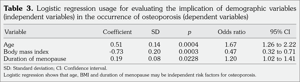 The study included 130 women (mean age 62.77±7.51 years; range 57 to 69 years) followed by the Rheumatology Clinic in the Clinical Emergency Hospital of Constanta and Clinical Railway Hospital Constanta between January 2008 and January 2010. The women reached menopause at ages between 49 and 75 years. Inclusion criteria were as follows: postmenopausal women meeting American College of Rheumatology 1987 revised criteria for RA, with disease duration of more than two years.(4) Exclusion criteria were as follows: having secondary OP related with an etiology other than RA, and taking corticosteroid treatment for diseases such as hyperparathyroidism, thyroid disease, and diabetes mellitus, having no BMD measurement.