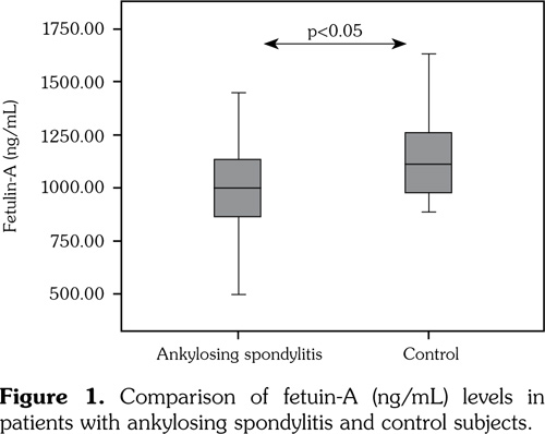 Ankylosing spondylitis (AS) is a chronic inflammatory disease of the axial skeleton of uncertain etiology characterized by backache and morning stiffness.(1) Several acute phase proteins, particularly erythrocyte sedimentation rate (ESR) and C-reactive protein (CRP), are used in AS as markers of disease activity to detect prognosis and evaluate treatment response.(2) These proteins are synthesized from the liver in response to cytokines that increase during inflammation. Another inflammation marker known as fetuin-A, which is largely secreted from the liver in adults, has recently been described. Fetuin-A protein has a molecular weight of 59 kD and is present at a serum concentration of 0.5-1 g/L.(3) Some authors have argued that fetuin-A is a negative acute phase protein.(4) Since serum levels decrease together with albumin in acute inflammation, it is thought to be a negative acute phase reactant.(4) Serum fetuin-A levels have been reported to decrease by 20-30% in diseases such as rheumatoid arthritis (RA), pancreatitis and chronic kidney failure.(5-7) Previous studies have also reported fetuin-A to be inversely correlated with levels of the proinflammatory cytokines interleukin-1 b, interleukin-6, and tumor necrosis factor-a.(8,9) However, others claimed that fetuin-A is a positive acute phase reactant although this hypothesis was supported by only one study. That study demonstrated that fetuin-A levels were elevated in AS patients.(10) It is therefore unclear whether fetuin-A is a negative or positive acute phase reactant. In this study, we aimed to investigate the association of serum fetuin-A levels with disease activation and clinical parameters in AS patients.
