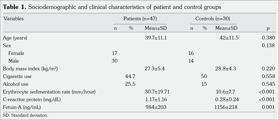 Patients and methods: Forty-seven AS patients (30 males, 17 females; mean age 39.7±11.1 years; range 20 to 69 years) and 30 healthy controls (14 males, 16 females; mean age 42.0±11.5 years; range 19 to 63 years) were included in the study. Erythrocyte sedimentation rate, C-reactive protein, Bath Ankylosing Spondylitis Disease Activity Index, Bath Ankylosing Spondylitis Functional Index, Bath Ankylosing Spondylitis Radiology Index, and Bath Ankylosing Spondylitis Metrology Index were used in the assessment of AS. Serum fetuin-A levels were measured using ELISA.