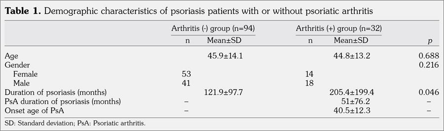 Thirty-two patients (25.4%) had PsA according to CASPAR classification criteria.(1) The demographic characteristics of the patients are summarized in Table 1. The duration of psoriasis was longer in arthritis (+) group (p<0.05).