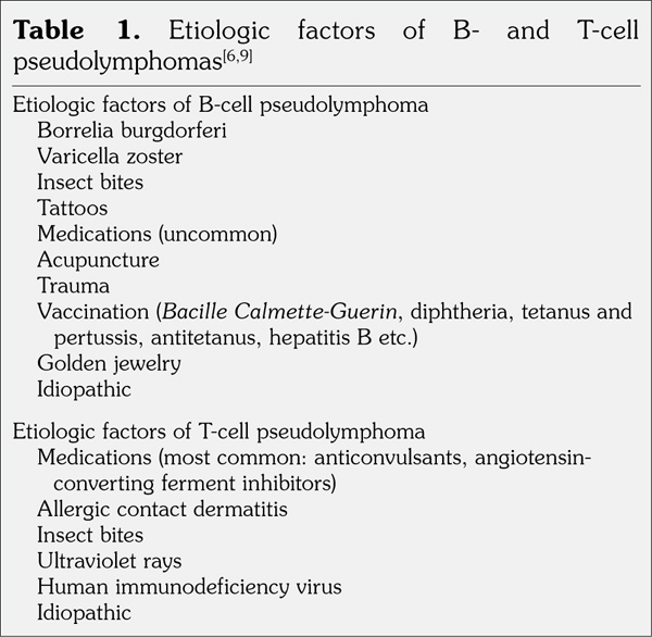 Cutaneous pseudolymphoma (CPL) is a term used to indicate a group of skin disorders defined as benign lymphoprolipherative reactions that may simulate cutaneous malignant lymphomas clinically and/or histologically.(1) These lesions represent a response to trauma, insect bites, stings, infections, tattoos, vaccinations, injection of foreign substances, pierced body jewelry, various drugs, and other undetermined stimuli.(2-7) Not many papers are published regarding this disease since it is not commonly found in everyday clinical practice. It is essential to diagnose CPL as early as possible and differentiate it from skin Bor T-cell lymphoma.