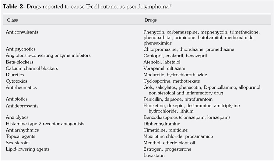 Cutaneous pseudolymphoma can be idiopathic or a reaction to various antigens. Etiologic factors of B- and T-cell pseudolymphomas are listed in Table 1. In most cases, etiologic factors of CPL remains unidentified.(6,9) Drugs reported to cause lymphomatoid drug eruptions are listed in Table 2.(9) Only few cases of CPL induced by biologics were reported (one case of etanercept, adalimumab, infliximab).(10,11) Cases of lornoxicam, cyclosporine, parenteral gold therapy, and methotrexate induced CPL were introduced in the literature.(12-14)