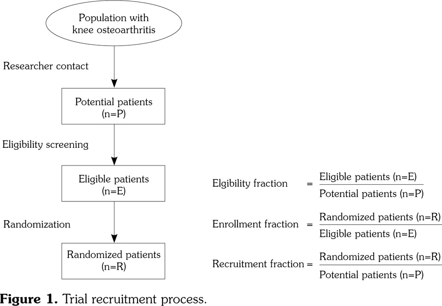 Previously, a possibility of delineating external validity was presented by calculating proportions of patients at each stage of the recruitment process (Figure 1).(8) Because flow diagrams depicting the recruitment process were emphasized in the Consolidated Standards of Reporting Trials (CONSORT) statement,(9) these scales are expected to be clearly calculated from KOA trials. Therefore, in this study, we aimed to investigate the external validity of KOA trials through a systematic review of randomized, placebo-controlled, clinical trials.