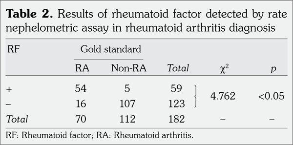 The positive rate of RF in the 70 RA patients was 77.1% (54/70), significantly higher than that in the non-RA patients (4.5%; 5/112) (Table 2). The difference was statistically significant (χ2 =4.762, p<0.05).