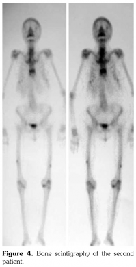 Case 1– A 73-year-old female patient presented with low back, knee, and anterior thigh pain. Pain severity was 8 over 10 point according to visual analog scale. She had difficulty in walking because of pain. She had a history of arthroscopic knee surgery for meniscal pathology in her left knee five years ago. She had chronic low back pain due to L4-5 disc herniation and lumbar spinal stenosis. She had been treated for osteoporosis with alendronate for two years, then with salmon calcitonin for two years and ibandronic acid for a year. Neurological examination was normal. Plain radiographs revealed bilateral lateral cortical thickening in the femur (Figure 1). Magnetic resonance imaging was done to rule out fracture. Bone scintigraphy showed increased uptake in bilateral femoral diaphysis. Routine biochemical tests were normal except increased urinary deoxypyridinoline. Urinary deoxypyridinoline level was 63 nM/mMCre (normal range: 3-7.4 nM/mMCre).