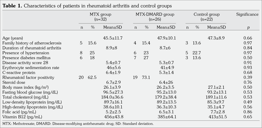 Methotrexate doses ranged from 7.5 to 15 mg/week in the MTX group. All patients taking MTX were also taking folic acid supplementation (10 mg/week). Table 1 presents the clinical and laboratory variables of MTX, non-MTX-DMARD, and control groups. There was no significant difference among the study groups with regard to the socio-demographic characteristics such as menopausal status, presence of hypertension, presence of diabetes mellitus, family history, physical activity, tobacco and alcohol consumption, education, and household income (p>0.05). The study groups were similar with regard to the parameters presented in Table 1 (p>0.05).