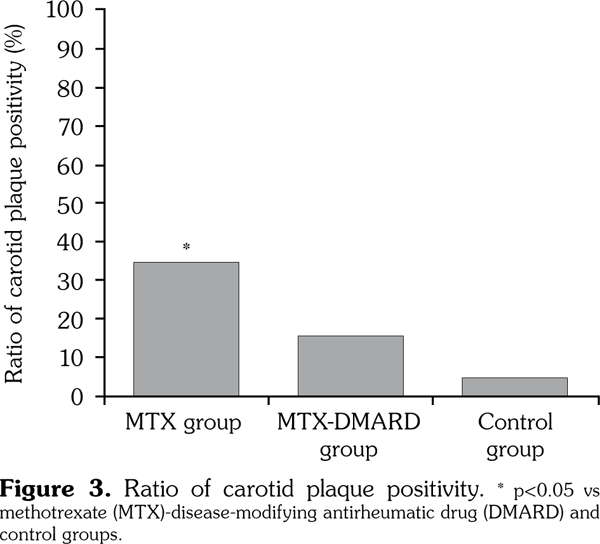 Patients and methods: Fifty-eight females with RA (mean age 45.50±11.69 years; range 42 to 60 years) and 22 female controls (mean age 47.3±8.9 years; range 38 to 62 years) with mechanical low back pain were included in the study. RA patients were divided into two groups: patients who were under methotrexate (MTX) therapy at least for two years (MTX group, n=32), and patients who did not receive MTX at least for past two years (non- MTX-disease-modifying antirheumatic drug group, n=26). RA patients’ disease activity scores in 28 joints were calculated. Carotid intima-media thickness and presence of atherosclerotic plaque were evaluated by high-resolution B-mode ultrasonography.
