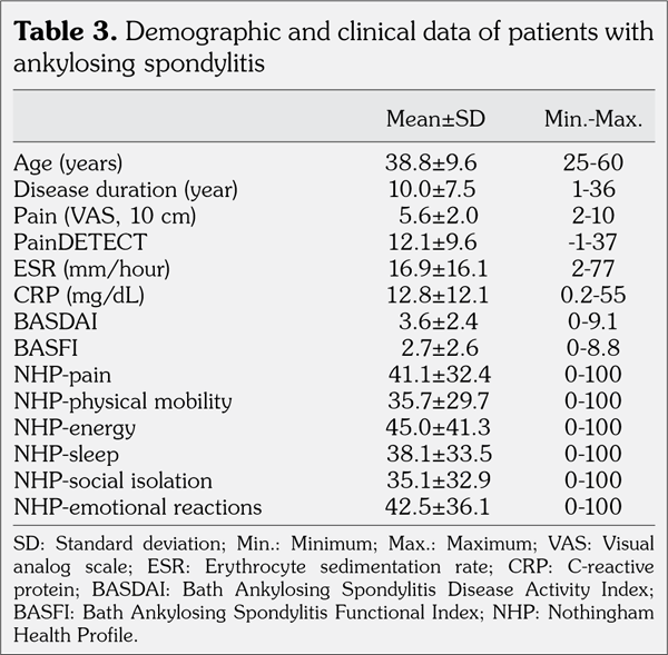 Patients and methods: A total of 150 patients (66 males, 84 females; mean age 48.44±12.22 years; range 25 to 65 years) were included in the study. Of these patients, 50 had OA, 50 had RA, and 50 had AS. Control group consisted of 50 healthy subjects (20 males, 30 females; mean age 48.36±12.68 years; range 25 to 65 years). OA severity was evaluated by Western Ontario and McMasters Universities Index of Osteoarthritis. In RA patients, Disease Activity Score-28 was used for measuring disease activity, and Stanford Health Assessment Questionnaire for functional status. In AS patients, disease activity was assessed by Bath Ankylosing Spondylitis Disease Activity Index and functional status by Bath Ankylosing Spondylitis Functional Index. Neuropathic pain was determined by PainDETECT questionnaire and quality of life by Nottingham Health Profile.