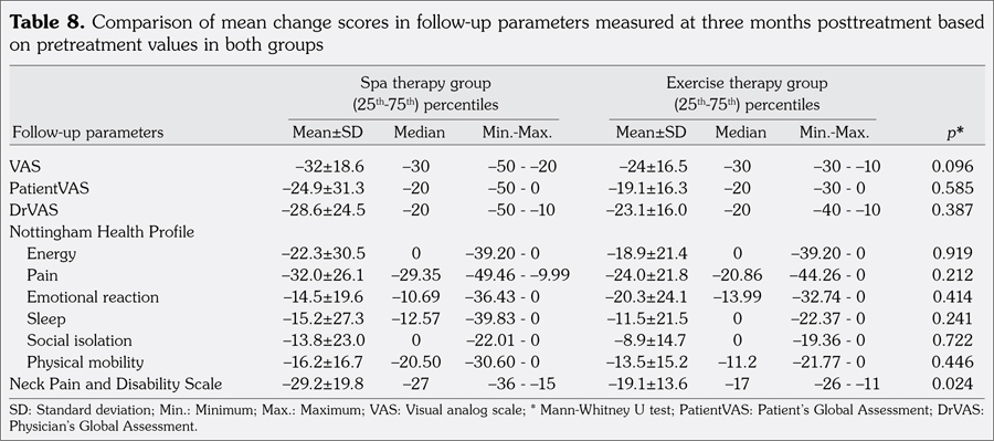 Statistically significant improvements were observed in all parameters assessed at both one week and three months after completion of treatment in spa therapy and exercise therapy groups. Then, mean changes achieved at one week and three months posttreatment were compared in both groups to determine which group had greater improvement.