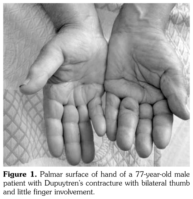 Dupuytren’s contracture (DC) is a benign fibroproliferative disease that affects the palmar fascia. As a result of progressive palmar fascial fibrosis, thickened nodules develop, nodules progress and increase in size to form cords that result in flexion contractures.(1,2) Restriction of daily activities and hand function impairment may occur depending on the severity and extent of the disease.(3) In this article, we presented a rare case of DC of bilateral thumb and fifth digit involvement in a male patient who was assessed by ultrasound elastography and had improved range of motion after rehabilitation.