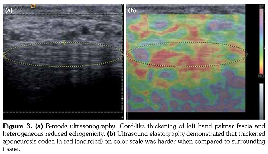 Sonoelastography provides a qualitative measurement of stiffness; therefore, we did not base our decision on the type of treatment according to sonoelastographic findings. However, sonoelastography may provide information about the mechanical properties of palmar fascia in addition to morphology and stage of involvement and it should be performed in conjunction with ultrasound examination for the diagnosis of DC. Unfortunately, we were unable to do elastographic assessment to follow-up our patient after treatment. Indeed, elastography may take a role in assessing the efficacy for the treatment of DC objectively by comparing the stiffness values. Further research is needed to support the outcomes of this study.