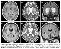 High dose intravenous methylprednisolone (500 mg/day) was prescribed for three days followed by oral prednisolone (1 mg/kg/day), and intravenous cyclophosphamide (600 mg/m2 body surface area) was prescribed once. Intrathecal injection of methotrexate (MTX) (10 mg) and dexamethasone (DXM) (10 mg) were applied once a week for two weeks. After these treatments, the patient showed steady improvements in her gait, speech and movements. Two weeks later, her blood showed normal level of complement 3 (0.84 g/L) and erythrocyte sedimentation rate (18 mm/h). She was discharged on maintenance of oral prednisolone (30 mg/day), oral hydroxychloroquine (200 mg/day), and intravenous cyclophosphamide (800 mg/month). At the patient’s two-month follow-up visit, we noticed that she had normal facial expression, speech, movement, and gait. Complement 3 (0.86 g/L) and erythrocyte sedimentation rate (12 mm/h) remained normal and the titer of antinuclear antibody decreased to 1:40. The Systemic Lupus Erythematosus Disease Activity Index was reevaluated with a score of 0. Patient was still in remission at nine-month follow-up, and her head magnetic resonance imaging was normal (Figure 1).