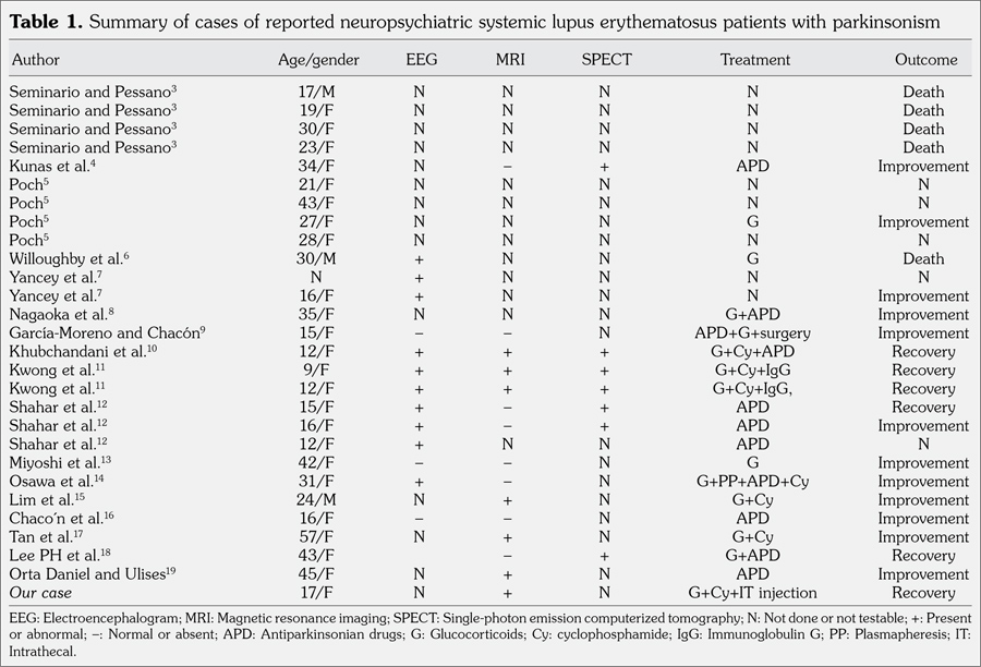 Neuropsychiatric systemic lupus erythematosus associated parkinsonism was first described by Seminario and Pesano in 1930.(3) Since then, only about 30 NPSLE cases with parkinsonism have been reported to date (Table 1).(3-19) Autoantibodies and immune-mediated vasculopathy was suggested in the pathogenesis of parkinsonism in NPSLE.(20) Kunas et al.(4) found antibodies to dopaminergic cells in serum from the NPSLE patients manifested with parkinsonism. They concluded that anti- dopamine antibodies could be specific to NPSLE patients with parkinsonism. However, to our knowledge, there are no controlled trials of any treatment for NPSLE with parkinsonism. Improvements have been reported in those patients treated with combination of steroids and cyclophosphamide, with or without anti- parkinsonian drugs.(10) In two cases, intravenous injection of immunoglobulins appeared to be effective after methylprednisolone and cyclophosphamide failed.(11) Intrathecal injection of MTX plus DXM, which was assumed to enhance the immunosuppressive effects but reduce side effects, has been shown to improve the outcomes of NPSLE patients without parkinsonism.(21) To our knowledge, our patient was the first NPSLE patient with parkinsonism reported to accept intrathecal injection of MTX plus DXM and obtain a satisfactory outcome. Although there was no control in our therapeutic regimen, results from this particular case support the notion that intrathecal injection of MTX and DXM, plus high dose intravenous methylprednisolone and cyclophosphamide for NPSLE patients with parkinsonism may be a plausible therapeutic strategy.