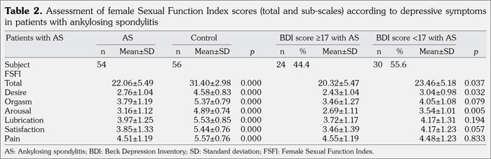 Patients and methods: Fifty-four AS patients (mean age 39.33±8.57 years; range 20 to 55 years) and 56 similar aged healthy controls were included in the study. Depression levels and sexual functions of all participants were evaluated by the Beck Depression Inventory and Female Sexual Function Index (FSFI), respectively. Other assessment methods included the visual analog scale for pain, fatigue, and importance of sexual life; Bath Ankylosing Spondylitis Disease Activity Index for disease activity, Bath Ankylosing Spondylitis Functional Index for functionality, Bath Ankylosing Spondylitis Metrology Index for spinal mobility, and Short Form-36 (SF-36) for quality of life.