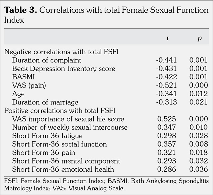 In patient group, there were negative correlations between total FSFI score and duration of disease, BDI score, BASMI score, VAS pain score, age and duration of marriage while positive correlations existed between total FSFI score and VAS importance of sexual life score and number of weekly sexual intercourse, SF-36 fatigue, SF-36 social function, SF-36 pain, SF-36 role limitations due to emotional health, and SF-36 mental component sores (Table 3). In patient group, no correlation was detected between total FSFI score and monthly income, number of living children, fatigue level, BMI, BASDAI, BASFI, SF-36 physical function, SF-36 mental health, SF-36 role limitations due to physical health, SF-36 general health status, and SF-36 physical component scores (p>0.05).