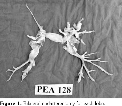 We decided to perform PEA, since our patient was in New York Heart Association functional class III, had PA hypertension, had no significant comorbidities, and showed computed tomography angiographic evidence of PA tree obstruction despite three months of anticoagulation. Other causes of PA hypertension were excluded. During surgery, the pulmonary arteries were thick walled and fibrotic, making the operation technically challenging. However, successful bilateral endarterectomy was performed for each lobe (Figure 1). Postoperative period was unremarkable since the mean PA pressure decreased from 45 mmHg to 25 mmHg and the patient was extubated on postoperative day one and discharged on postoperative day 10.