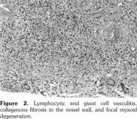 The histological work up showed lymphocytic and giant cell vasculitis, collagenous fibrosis in the vessel wall, and focal myxoid degeneration (Figure 2). Takayasu’s arteritis was considered in differential diagnosis and a magnetic resonance angiography scan of thorax and abdomen showed significantly decreased right subclavian artery calibration whereas abdominal aorta, renal arteries, and celiac trunk calibration was normal. Rheumatoid factor, antinuclear antibodies, anti deoxyribonucleic acid antibody, viral serology, and antineutrophil cytoplasmic antibody were all negative.