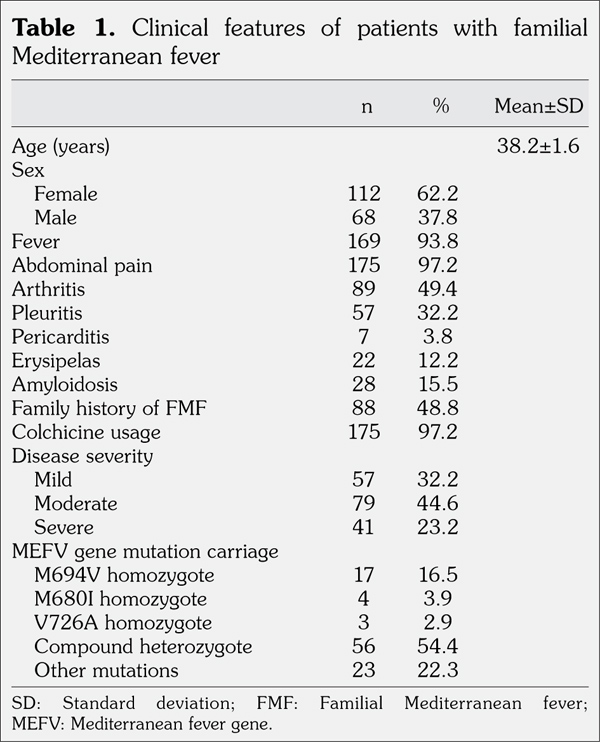 A case-control study was conducted at Ankara University Medical Faculty, Department of Rheumatology, Turkey, between March 01, 2008 and March 01, 2009. One-hundred eighty patients with FMF (68 males, 112 females; mean age 38.2±1.6 years; range 16 to 81 years) and 184 blood bank donors that served as healthy controls (86 males, 98 females; mean age 32.9±9.2 years; range 18 to 58 years) from the same hospital were included in the study. The mean disease duration was 113±87 months in patients with FMF. All patients and controls were enrolled with local ethics committee approval and provided their informed consent. The study was conducted in accordance with the principles of the Declaration of Helsinki. The diagnosis of patients with FMF was made using criteria suggested by Livneh et al.(12) The patients with autoinflammatory diseases, chronic inflammatory and autoimmune diseases except FMF were excluded. Detailed clinical features and demographic data were recorded for each patient. The presence of amyloidosis, positive family history of FMF, and MEFV gene mutations were also detected. Disease severity