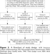 4- According to American College of Rheumatology diagnostic criteria, pressure pain threshold values of 18 tender points and four control points were measured in Newton/cm(2) with a J tech algometer (J-Tech Medical Industries, Salt Lake City, UT) to calculate the TMS.(22-24) Flowchart has been depicted in Figure 1.