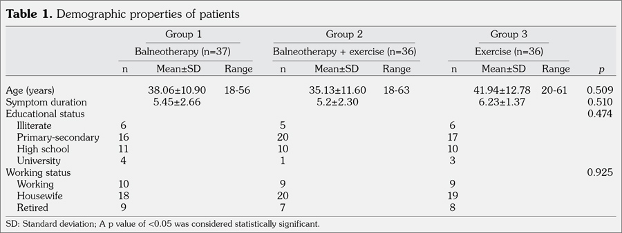Patients and methods: A total of 120 female subjects (mean age 37.21±12.45 years; range 18 to 63 years) diagnosed with fibromyalgia were enrolled. The patients were randomized into three groups with 40 patients in each (group 1: balneotherapy group, group 2: balneotherapy + exercise group, and group 3: exercise group). The patients underwent the treatment program for five days a week for a total of three weeks. Clinical parameters, Fibromyalgia Impact Questionnaire, Pittsburgh Sleep Quality Index, TMS, and Beck Depression Scale were evaluated at pre-treatment and post- treatment periods, and at the third-month control visit.
