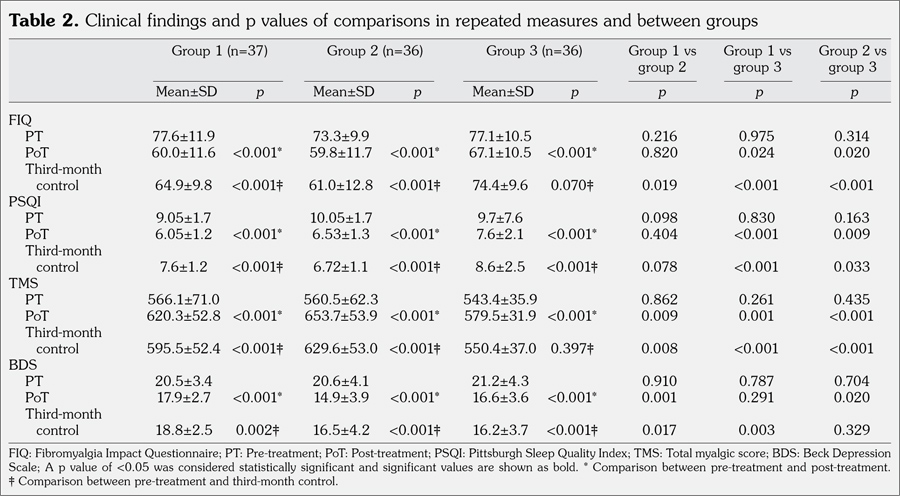The mean age of the 109 patients who completed the study was 36.62±11.26 (range 18 to 63 years) years. Groups were similar with respect to demographic data and baseline evaluations (Tables 1 and 2) (all p>0.05). However, all groups improved significantly with respect to FIQ, PSQI, TMS, and BDS scores at PoT (all p<0.05) and these improvements persisted in groups 1 and 2 at third-month control (all p<0.05) (Table 2). On the other hand, there was no significant difference between pre-treatment and third-month FIQ (p=0.070) and TMS (p=0.397) scores in group 3.