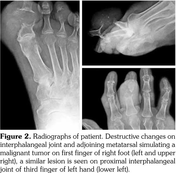 Radiography showed destruction on the IPJ and adjoining metatarsal simulating a malignancy on the first finger of right foot. A similar lesion was noticed on the proximal IPJ of the third finger of the left hand (Figure 2). Besides, soft tissue swellings, periarticular erosions, and osteophytes were seen. On sonography, a few echogenic foci compatible with nephrolithiasis were detected in the right kidney.