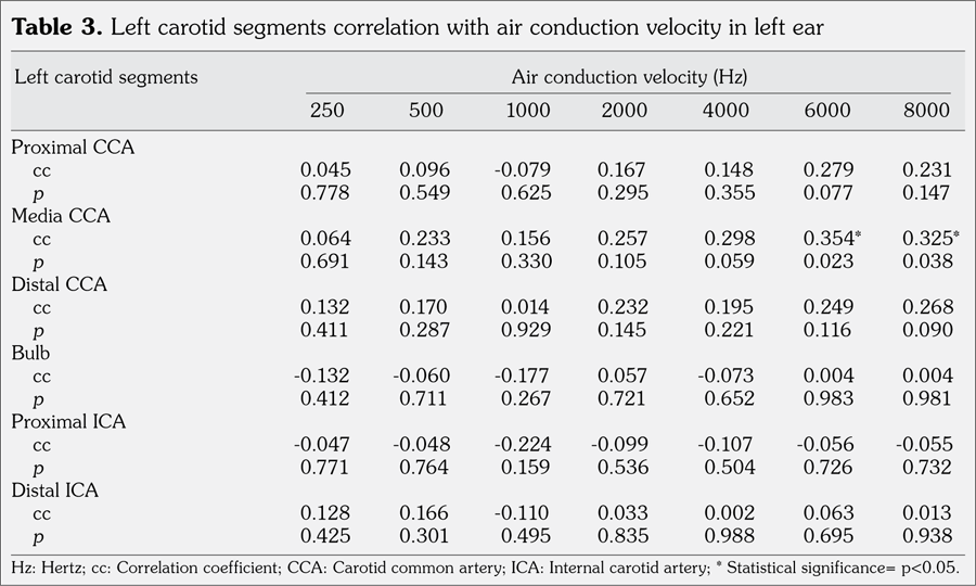 In addition, we found a positive correlation between medial CCA cIMT values and abnormal audition at 6000 Hz (cc 0.354, p=0.023) and 8000 Hz (cc 0.325, p=0.038) in the contralateral ear and artery, as shown in Table 3.