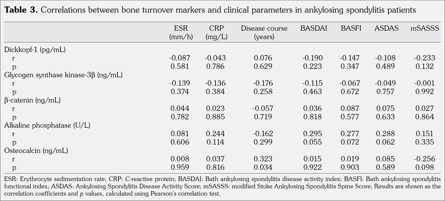 Results: No significant difference was observed between AS patients and healthy controls for the levels of glycogen synthase kinase-3β, β-catenin, alkaline phosphatase, and osteocalcin, respectively (p>0.05). The level of Dickkopf-1 was significantly higher in AS patients (1914.5±407.8 pg/mL) than in healthy controls (1729.1±352.9 pg/mL) (p<0.05). There was no correlation between high Dickkopf-1 level and any of the clinical parameters contributing to inflammation or bone formation. However, the correlation between osteocalcin and disease duration was significant in AS patients (r=0.323, p=0.034).