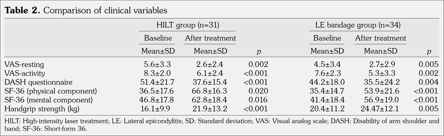 Sixty-five elbows with LE were randomized into HILT (n=31) and LE bandage (n=34) groups via coin toss. HILT lasted two weeks, whereas other patients were recommended to wear LE bandage for six weeks. Activity and resting visual analog scale (VAS), Disabilities of the Arm Shoulder and Hand, Short-Form 36 (SF-36), and hand grip strength values were recorded before and after treatment. Post-treatment evaluation was performed at the sixth week following the end of the treatment. Throughout the study, patients were discouraged to use analgesics; yet, they were allowed to use 500-2000 mg paracetamol daily if necessary. Patients were asked not to use analgesics 24 hours prior to the evaluation.