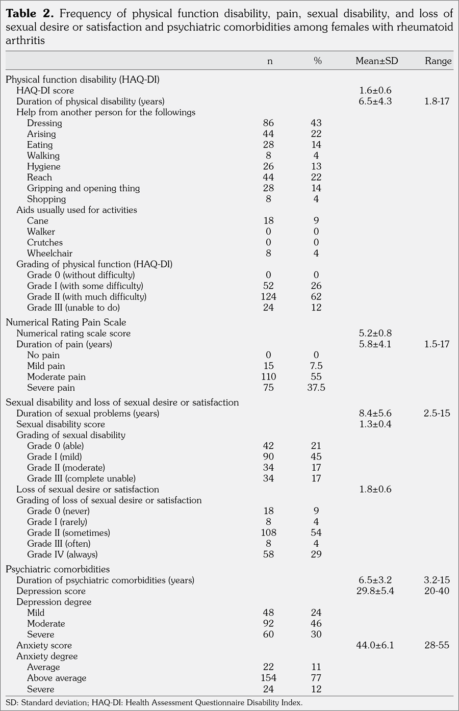 Patients and methods: The study included 200 female RA patients (mean age 44.2±9.1 years; range 18 to 55 years) and 100 age matched healthy control females (mean age 42.5±6.3 years; range 18 to 55 years). Mean duration of RA was 5.8±4.1 years. All participants were assessed by Health Assessment Questionnaire Disability Index, Numerical Rating Pain Scale, Sexual Disability Scale, psychiatric interview, Beck Depression Inventory, and Spielberger's State-Trait Anxiety Inventory.