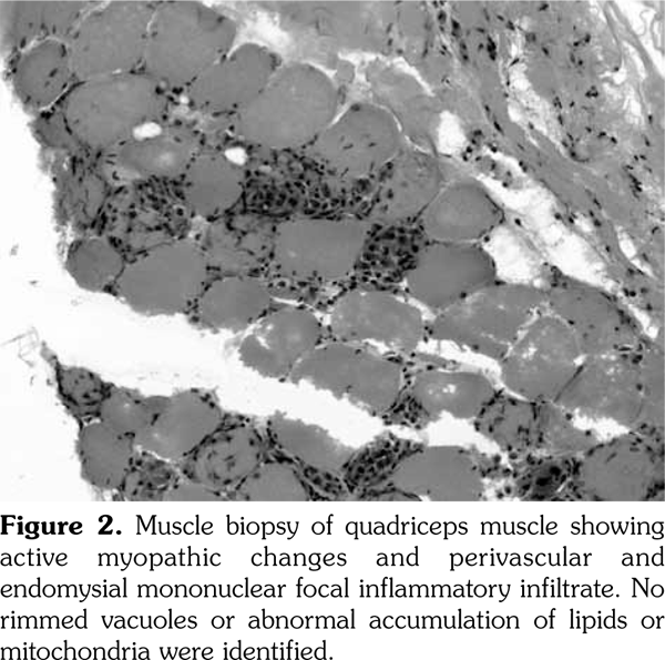 A biopsy of quadriceps muscle demonstrated active myopathic changes and perivascular and endomysial mononuclear focal inflammatory infiltrate (Figure 2). No rimmed vacuoles or abnormal accumulation of lipids or mitochondria were identified. The immunohistochemical staining for major histocompatibility complex class 1 was equivocal. Histochemical stains showed normal myophosphorylase, phosphofructokinase and myoadenylate deaminase, succinate dehydrogenase, nicotinamide adenine dinucleotide + hydrogen and cytochrome oxidase activity. These findings confirmed the diagnosis of polymyositis.