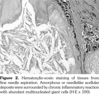 A 54-year-old male patient was admitted to our department with palmar numbness and disability for two years. He had a history of gout for 30 years but received no treatment. Physical examination revealed obvious subcutaneous tophi and thenar muscle wasting. Flexion deformity of his metacarpophalangeal and interphalangeal joints is shown in Figure 1a. Positive Tinel’s sign and Phalen’s maneuver were present. Routine laboratory test showed high level of uric acid (608 μmol/L). The electrophysiological examination revealed sensory and motoring demyelinating and axon lesions in both median nerve, especially in the right hand, which supported the diagnosis of CTS. Furthermore, DECT showed extensive monosodium urate crystals in the intercarpal and radiocarpal joints with compression overlying the flexor tendons (Figure 1b, c). We also observed punched-out bony erosions in the carpal bones (Figure 1d). These aspects indicated severe and typical CTS caused by gouty tophi, which was further confirmed by biopsy of fine-needle aspiration (Figure 2). Surgery was recommended, but the patient refused to undergo surgery and chose to receive febuxostat. Uric acid level had decreased in the next six-month follow-up with little improvement for his numbness and deformity. A written informed consent was obtained from the patient.