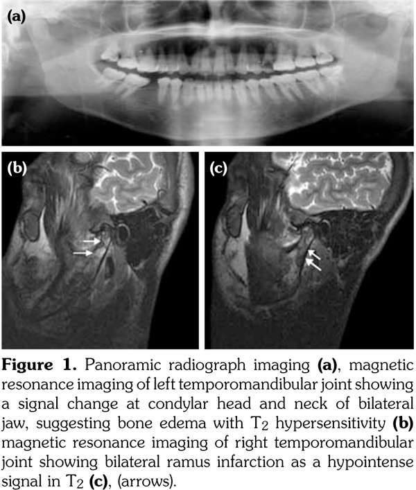 A 24-year-old male patient was admitted to the Otorhinolaryngology Department with complaints of pain for three days in the bilateral preauricular region. The pain was constant, severe, and increased when he reclined, chewed or talked. There was no medical history of fever or trauma. Physical examination findings included mild edema, allodynia, and hyperalgesia in the bilateral preauricular area and bilateral masseter muscle. Panoramic radiograph showed limited interincisal mouth opening (12 mm) (Figure 1a). A written informed consent was obtained from the patient.