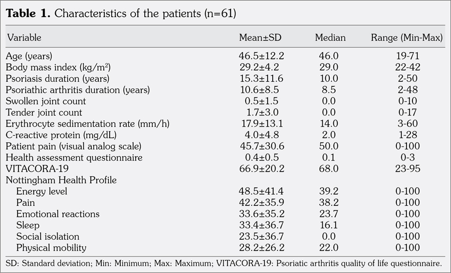 The study was conducted at the Department of Physical Medicine and Rehabilitation of Medical Faculty of Ondokuz Mayıs University between January 2015 and May 2015. The study was approved by the Faculty Ethics Committee. A written informed consent was obtained from each participant. The study was conducted in line with the principals of the Declaration of Helsinki. The study sample included 61 PsA patients (22 males, 39 females; mean age 46.5±12.2 years; range 19 to 71 years). Inclusion criteria were fulfilling the classification criteria of PsA(21) and being over 18 years of age. Individuals with psychiatric disorders which may affect QoL scores or who were not fluent Turkish speakers were excluded.