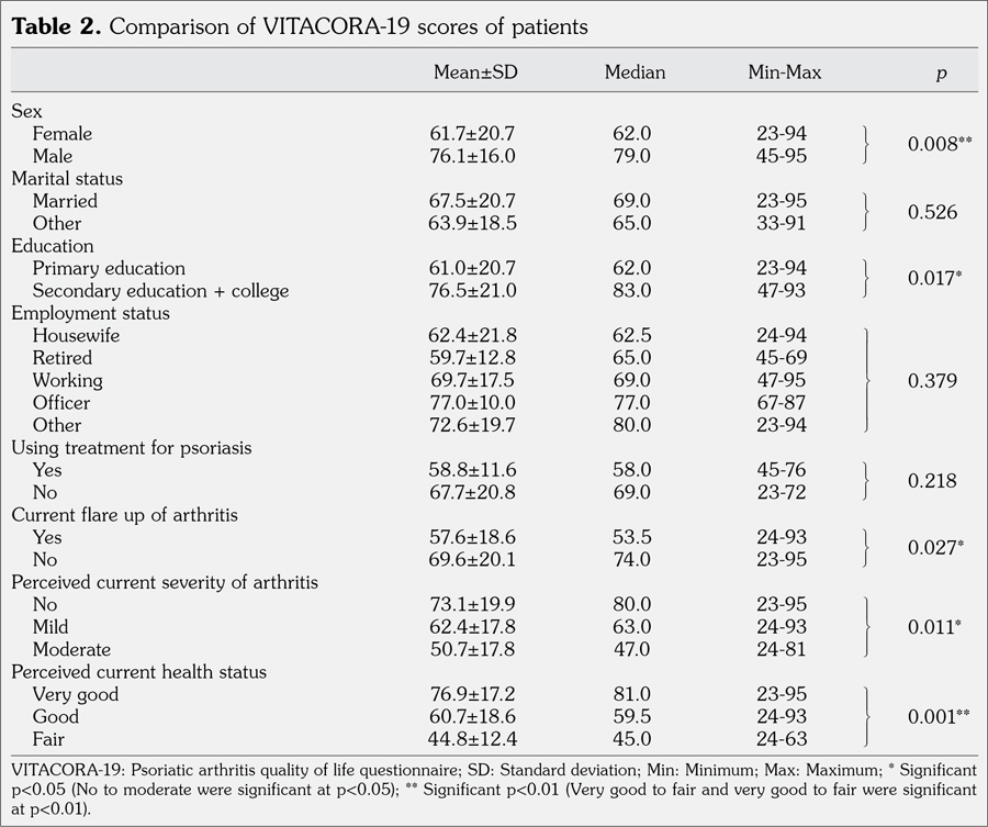 Demographic and disease-related data of the patients are given in Table 1. The Turkish VITACORA-19 scores were significantly higher in male subjects than females, (p<0.001), in secondary education (p<0.05), in subjects who had not perceived current severity of arthritis as mild (p<0.05), and in subjects who had perceived current health status as very good (p<0.001). Patients reporting a flare of their arthritis also had significantly lower scores in VITACORA-19 compared to patients without a flare (p<0.05) (Table 2). There was no statistically significant difference in Turkish VITACORA-19 scores between married and employed subjects and in subjects who were on treatment for psoriasis (p>0.05) (Table 2).