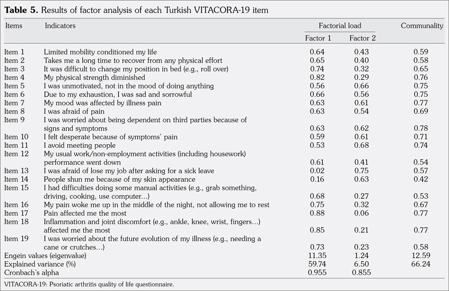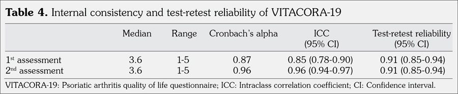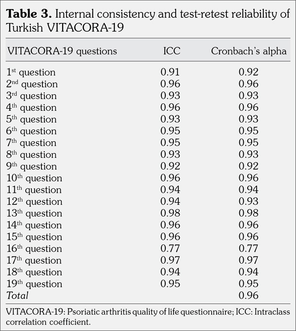 Patients and methods: The Turkish version of VITACORA-19 questionnaire was obtained after a translation and back translation process. The study sample included 61 PsA patients (22 males, 39 females; mean age 46.5±12.2 years; range 19 to 71 years). To assess the test-retest reliability of the Turkish VITACORA-19, the questionnaire was reapplied 10 to 15 days after the first interview (interclass correlation coefficient). Cronbach’s alpha (a) was used to evaluate the internal consistency. VITACORA-19 was compared with visual analog scale for physician and patient global assessments, the Health Assessment Questionnaire, and Nottingham Health Profile for construct validity. The internal structure of VITACORA-19 was examined by factor analysis.