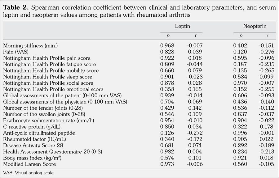 In RA group, no correlation was detected between serum leptin and neopterin levels and clinical and laboratory parameters which demonstrated disease activity (Table 2).