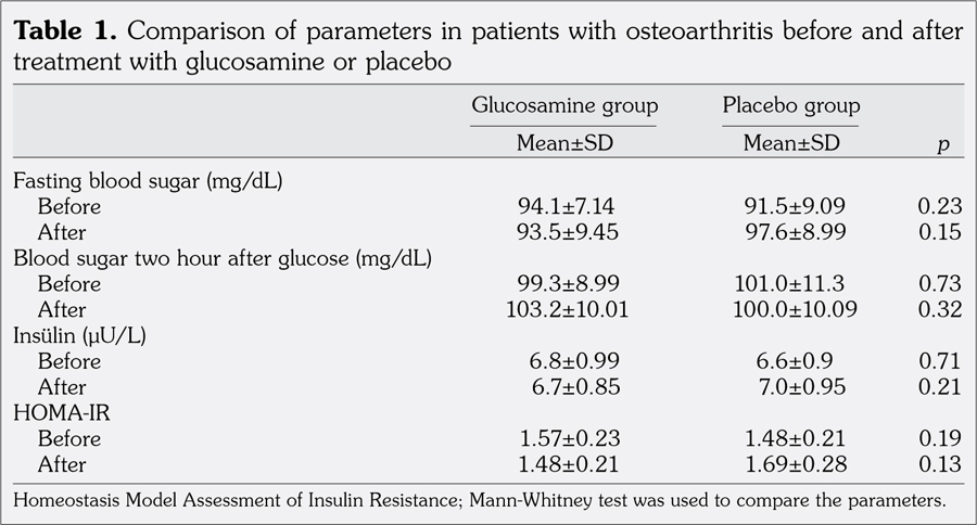 Patients and methods: This placebo-controlled, randomized clinical trial included 40 non-diabetic patients with osteoarthritis (15 males, 25 females, mean age 63.8±7.64 years; range 49 to 80 years). Patients were randomly divided into two equal groups and treated with oral glucosamine sulfate 1500 mg a day or placebo for 90 days. Fasting blood sugar, glucose tolerance test with 75 grams glucose and serum insulin levels, and homeostatic model assessment-insulin resistance were evaluated initially and at the end of intervention.