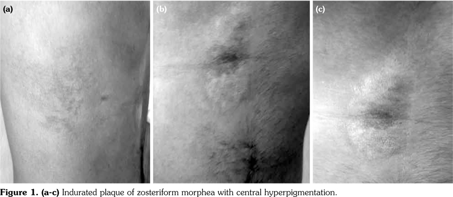 An 18-year-old healthy, male patient presented with complaints of hardness and discoloration of the skin at the right posteroinferior side of his trunk with a zosteriform distribution of T10-12 dermatomes, over a period of two years. We detected no characteristic finding in his medical/family history and physical examination except indurated plaque that measured 9x6 cm in diameter with central hyperpigmentation among the xyphoid and umbilicus that extended to the lateral part of the trunk with atrophic lesions in a zosteriform distribution (Figure 1). We detected no history of herpes zoster or other skin lesions on the site of ZM, abnormal skin moisture, suggestive signs of other extracutaneous, musculoskeletal or systemic sclerosis. Serology for varicella-zoster