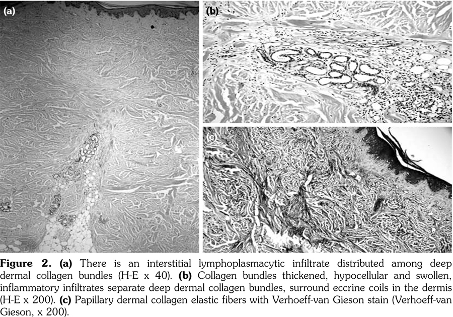 virus tested negative for immunoglobulin M, but positive for immunoglobulin G. Anti-nuclear antibody, anti-human immunodeficiency virus, first-tier immunoglobulin M and immunoglobulin G enzyme immunoassays for Borrelia were negative. A skin biopsy revealed an interstitial lymphoplasmacytic infiltrate which surrounded eccrine coils and distributed among separated deep dermal thickened, hypocellular and swollen collagen bundles, and papillary dermal collagen elastic fibers (Figure 2). Laboratory studies including blood cell count, serum chemistry, and autoantibodies (antinuclear antibodies and anti- Scl-70 also called anti-topoisomerase 1) were all normal or negative. Clinical and pathological features were consistent with the diagnosis of morphea. A written informed consent was obtained from the patient.