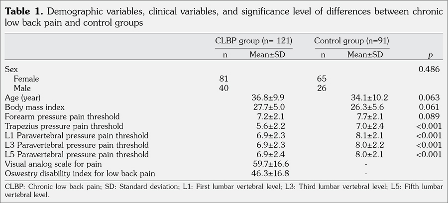 Patients and methods: A total of 121 patients (40 males, 81 females; mean age 36.8±9.9 years; range 18 to 50 years) having CLBP and 91 healthy controls (26 males, 65 females; mean age 34.1±10.2 years; range 18 to 55 years) were included. Pressure pain thresholds (PPTs) of all participants were examined with manual algometer in certain sites of their body.